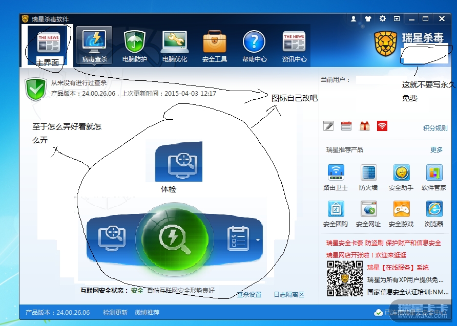 5.新增主界面 增加体检:垃圾、痕迹、优化、最近杀过毒没