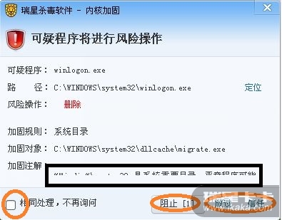 5、瑞星都报警提示了,就不能增加一个阻止的功能(如下图)?没有阻止的功能,你叫用户怎么办?请添加相应处理功能