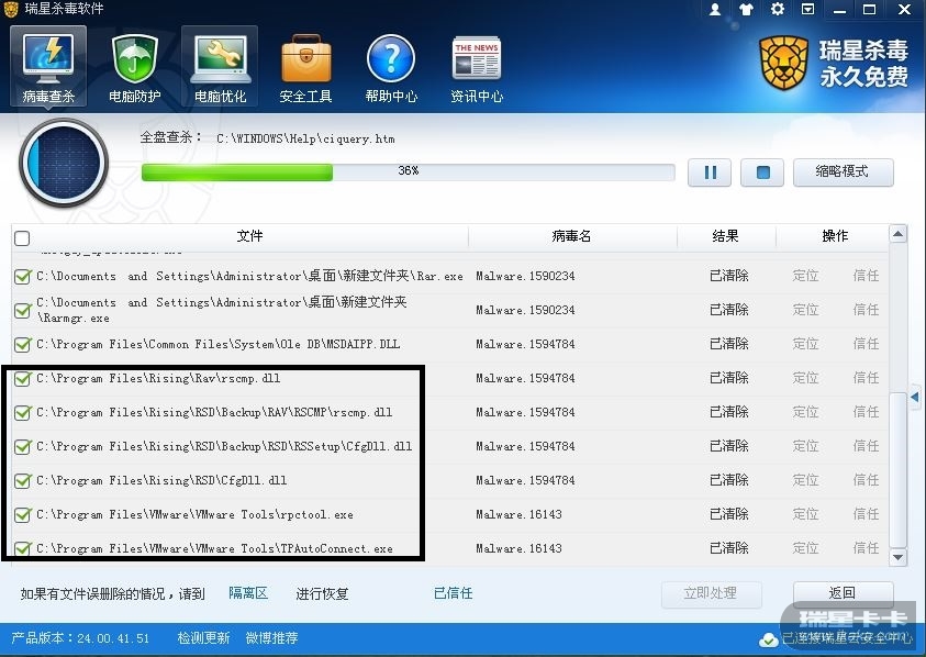 4、最大的问题就是不能处理交叉感染或 瑞星一边扫描病毒,而病毒一边联网下载病毒或一边感染文件,导致病毒永远无法彻底清除!!!!