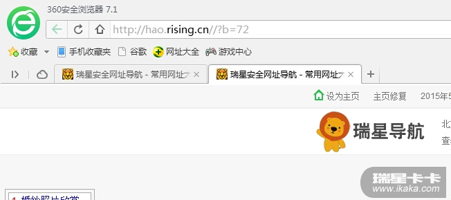 http://hao.rising.cn/?b=1,去掉设置中浏览器主页锁定的勾选后,主页正常。