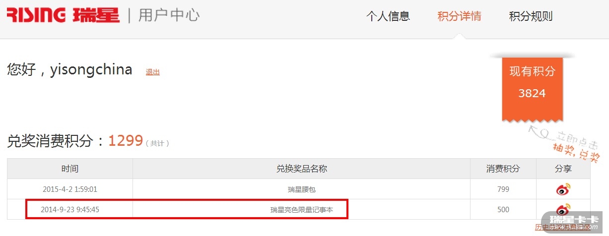 今天晒完小腰包的单,晒单积分也很快就进了我的账户,很开心。刚才还翻出了去年兑换的一个亮色笔记本,也来晒一晒。希望还能获得晒单积分。同时附上当时的订单信息,以免瑞星小编认为我是忽悠积分的。 :kaka16:
