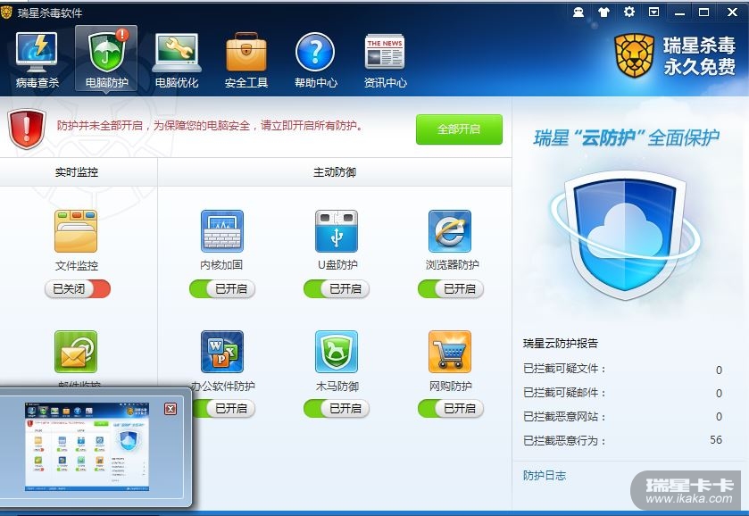 1、模拟瑞星没有入库的情况下,关闭文件监控