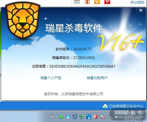 请打开瑞星主界面右上角的关于,将里面显示的注册信息发来。
