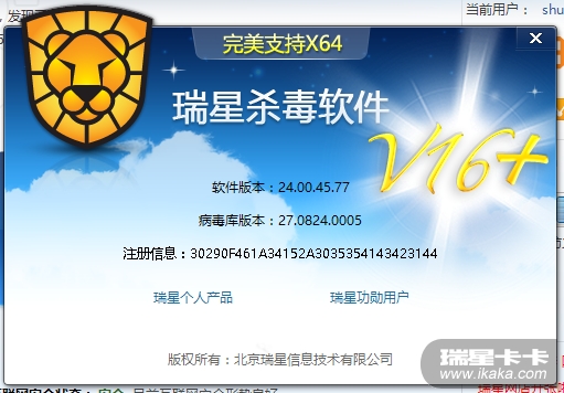 如果您还愿意继续使用,请打开瑞星主界面右上角的关于,将里面显示的注册信息发来。