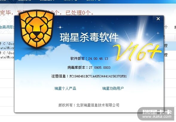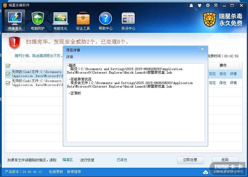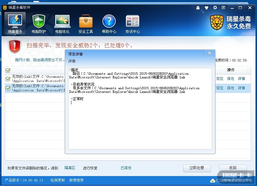 使用瑞星杀毒做任务时,出现误报的现象。(如图所示)