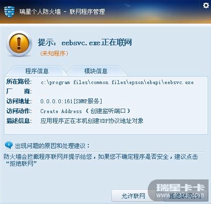 以前“影响瑞星的程序被阻止”的提示出现时在日志里都有记录,这几次日志里都没有记录,会不会是外面的攻击?昨天联网时出现下面的提示,点“拒绝联网”几次才将它关闭,这又是什么?