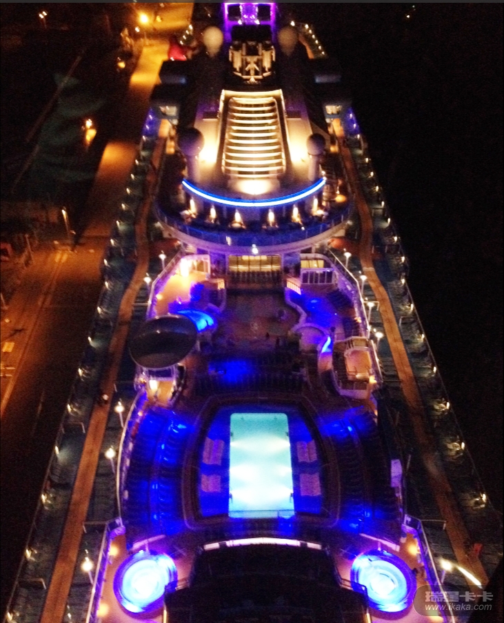 夜晚在北极星上面俯瞰海洋量子号的船体