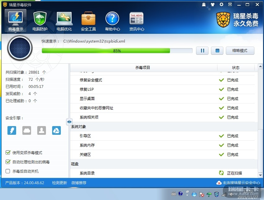 1、瑞星杀软是默认设置的;