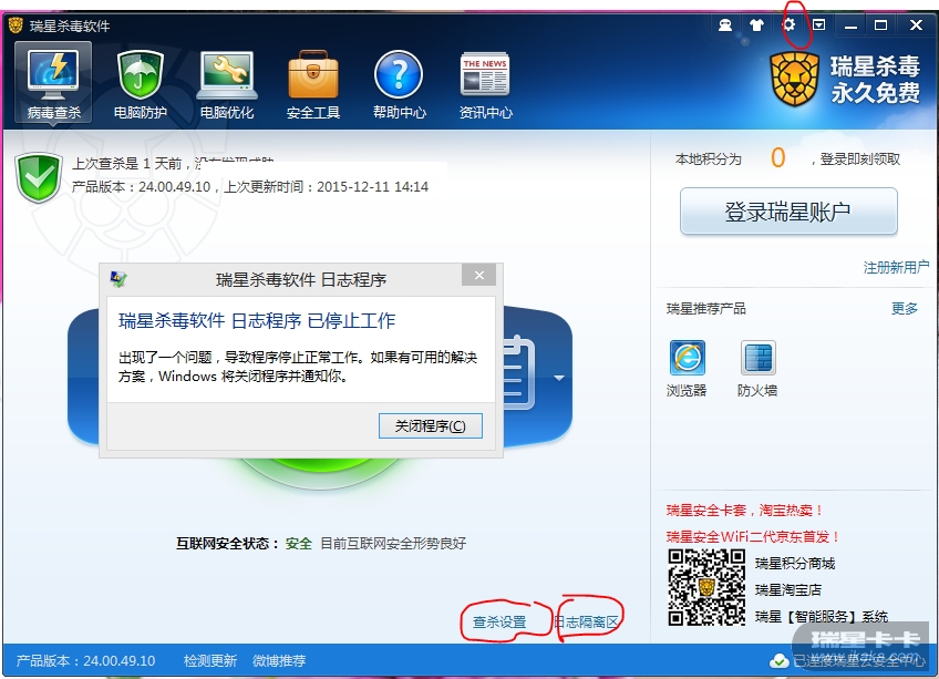 win8.1系统,瑞星杀毒软件出现问题:点选“查杀设置”、“日志程序”、“程序设置”出现问题。