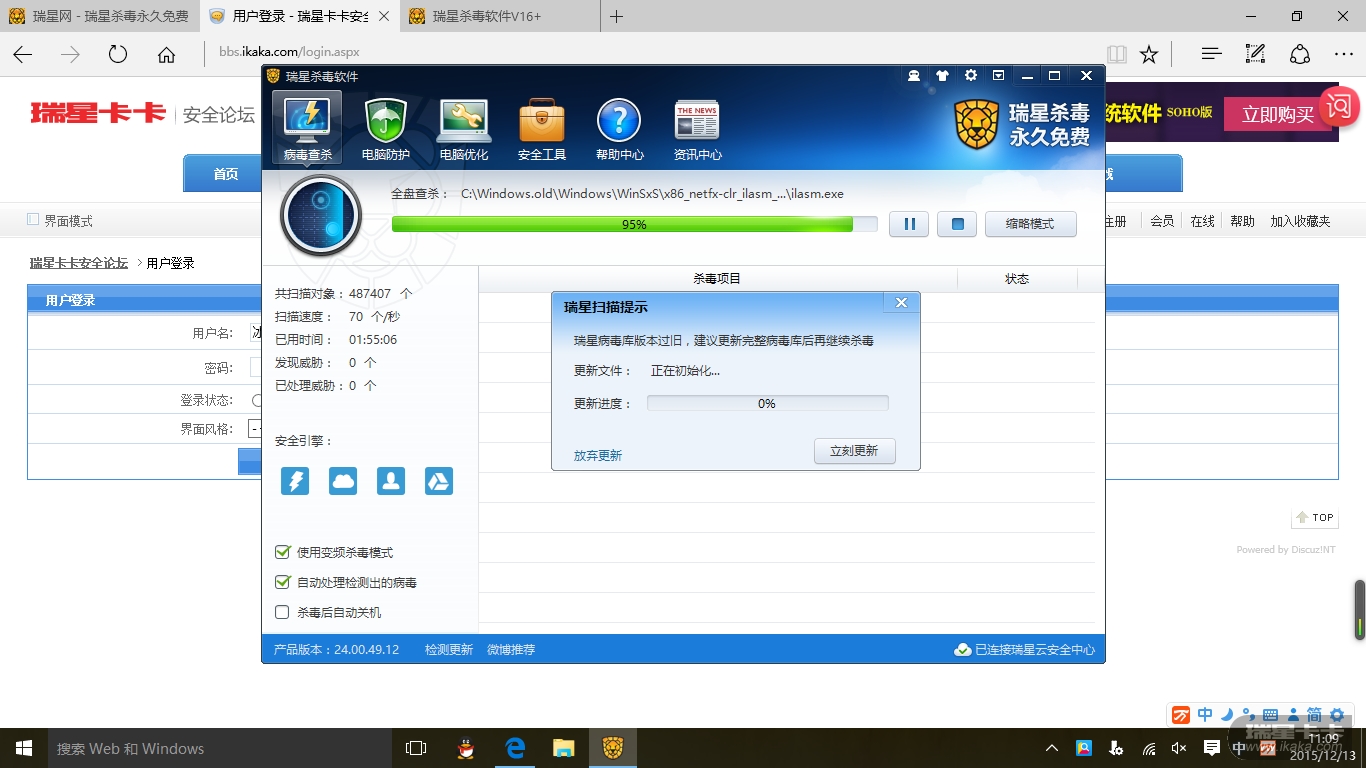 我是昨天在新的Dell笔记本上下载了V16+,安装完毕后尝试全盘杀毒,但是软件弹出提示:瑞星病毒库版本过旧,建议更新完整病毒库后再继续杀毒。我点击右下角的立刻更新,但是之后永远就是更新文件处于正在初始化状态,更新进度一直显示为0%,挂一晚上没有任何进展。我想请问如何解决这个问题?我的系统是Win10。