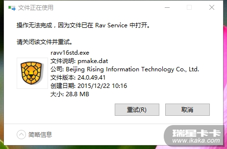 请查看进程里是不是有ravv16std.exe,如果有,结束后再删除试试。
