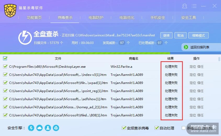 目的: 模拟 未入库 病毒发作后的情况 , 双击运行病毒操作:1、关闭所有防御, 后 运行 所有 样本文件2、让病毒飞一会, 充分活动起来3、开启所有防御 ,全盘查杀结果:1、处理失败!!!2、多次都是处理失败!!!3、日志无法导出! 点击保存,但是日志文件并没有生成!!!db模式 ,点击保存 ,但是日志文件无法生成,没有任何提示错误,就是没有这个文件!