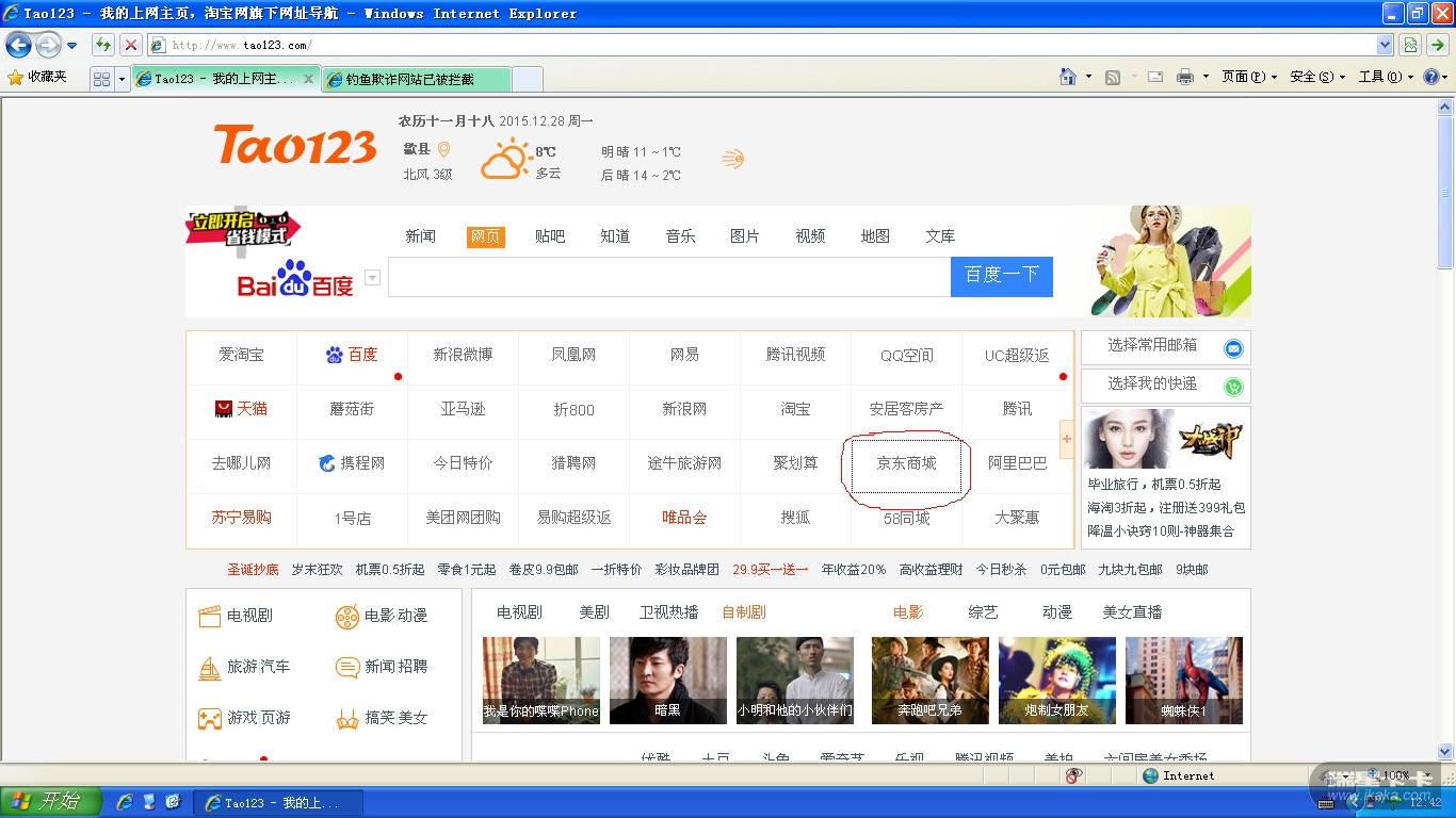 www.uc123.com" target="_blank">www.tao123.com和[url=www.uc123.com]www.uc123.com两个导航主页,点击京东商城出现恶意拦截。家里两台装瑞星的电脑都出现些问题!用公司的电脑(装的是360,点击正常,无此问题)。麻烦解决下!