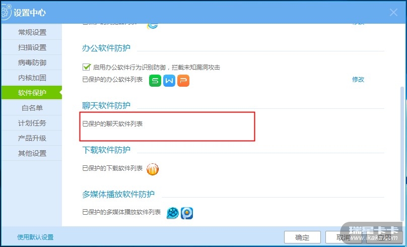 查看“”时,发现聊天软件防护里没有保护的对象。(如图所示)