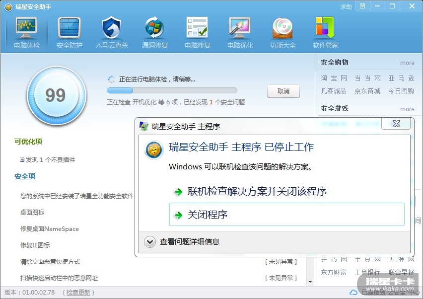 看看瑞星安全助手安装目录下是否有类型为.dmp的文件,请跟帖上传。