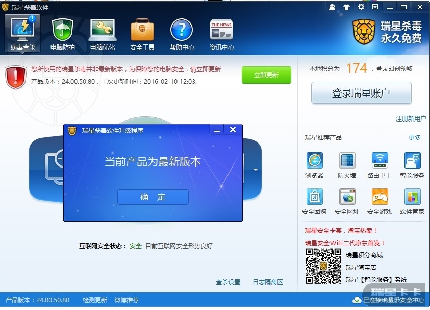 瑞星主界面显示上次更新时间是2016-2-10,提示不是最新版本,需要立即更新。可是点击立即更新后,又提示当前已经是最新版本。这是怎么回事? 详见附件的截屏。