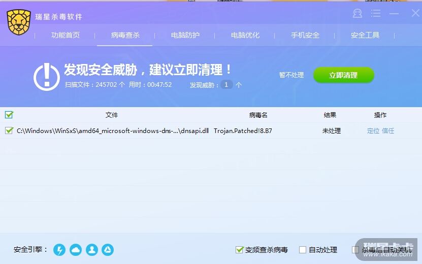 瑞星查毒后,清除病毒后,重启电脑,病毒再次出现。