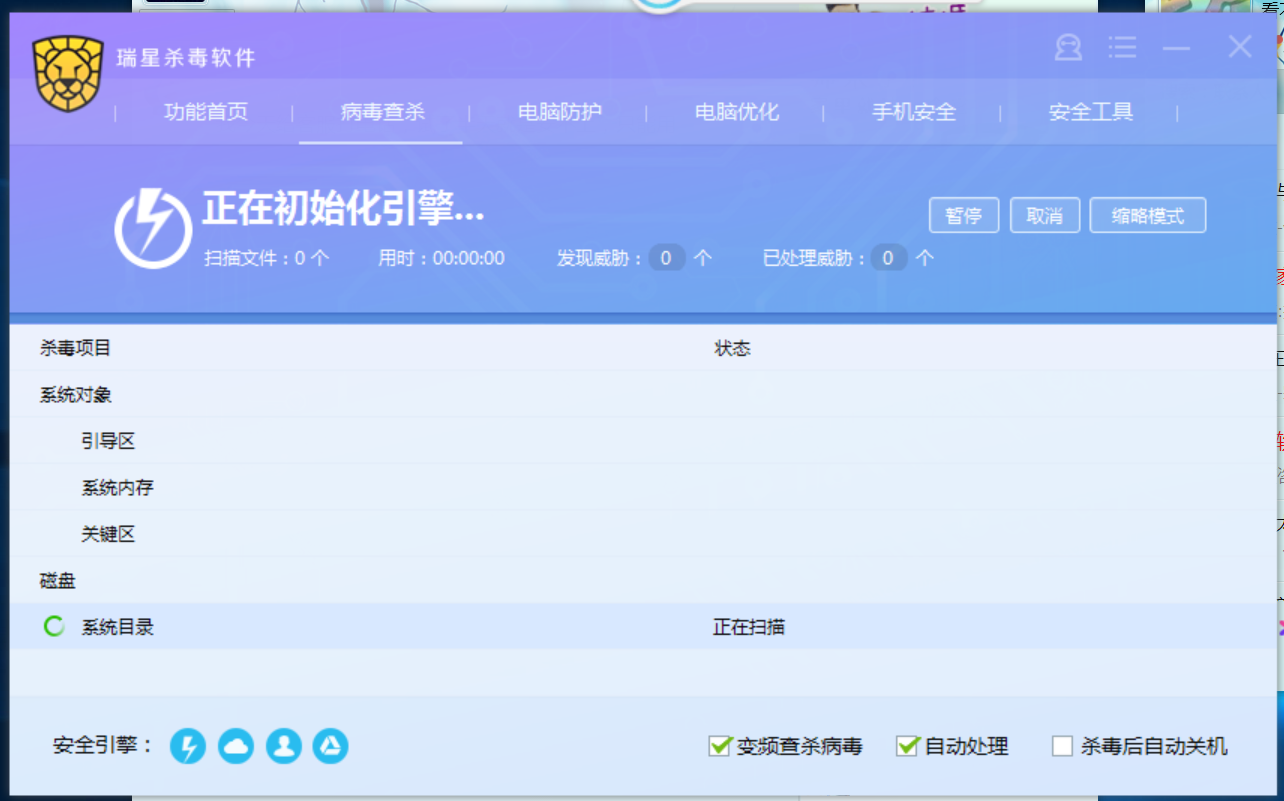 我是购机自带win10,瑞星杀毒V17 不能杀毒扫描,一直处在“正在初始化引擎”状态下。Win10自带的浏览器:Microsoft Edge。
