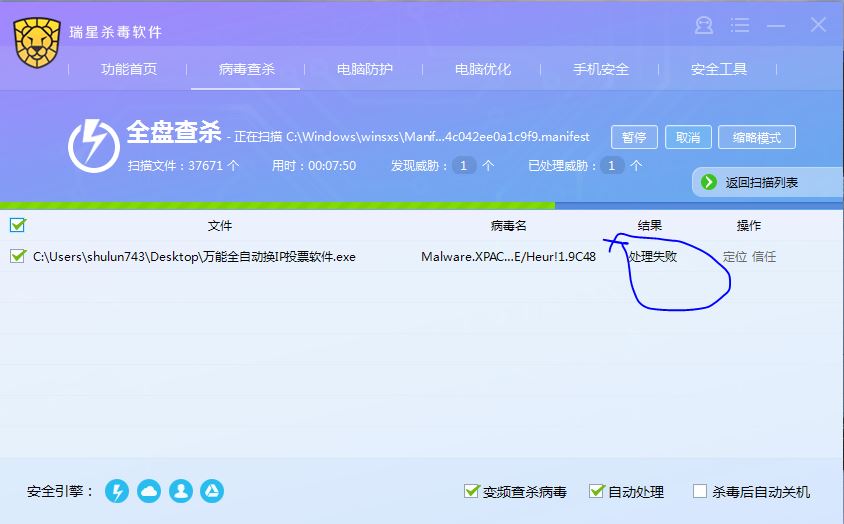 win7-32 运行病毒后,处理失败了