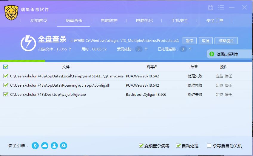 系统:win7-32操作:a、文件监控 默认b、系统加固 设置为 最高c、双击运行病毒结果:1、文件监控报警并点击清除病毒的情况下,病毒成功运行!!! 2、行为防御没有报警 , 系统加固 也装哑巴 ,请改进!!!3、后台偷偷推广 ,现在 数字 金山 火绒 和 管家都能 拦截 后台推广,为何 瑞星一直不做这个 功能呢???人家的 还有弹窗拦截 ,瑞星有什么???