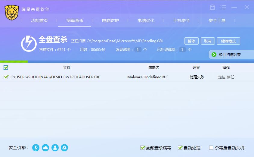 系统:win7-32操作:a、文件监控 默认b、系统加固 设置为 最高c、双击运行病毒结果:1、文件监控报警并点击清除病毒的情况下,病毒成功运行!!2、系统加固、行为防御没有报警 ,请改进!!!3、全盘 又一次 哎