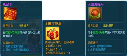 【宠物经验礼包】:使用可获得:大型仙宠经验药×1、小型仙宠经验药×1、初级仙宠经验符×2