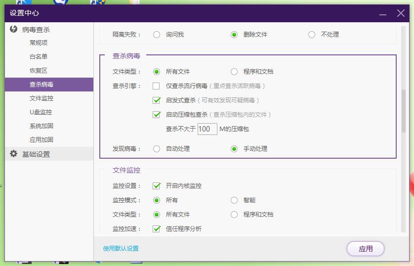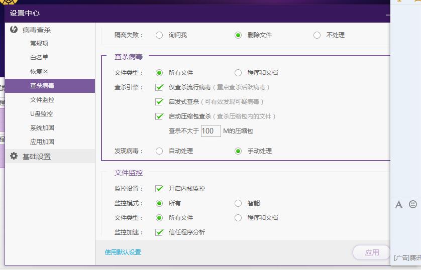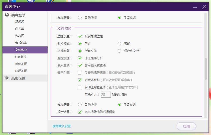 第二个问题是,通过文件监控设置,将监控所有文件勾上,并去掉仅查杀流行病毒选项后