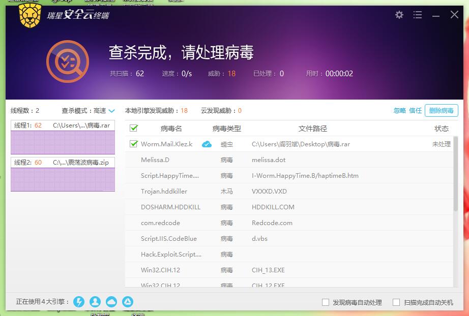 ,用这个病毒包(这个病毒包是十几二十年前比较有代表性、破坏力较强的的病毒)来测试,发现18个病毒。然后查杀病毒设置选项上去掉仅查杀流行病毒选项