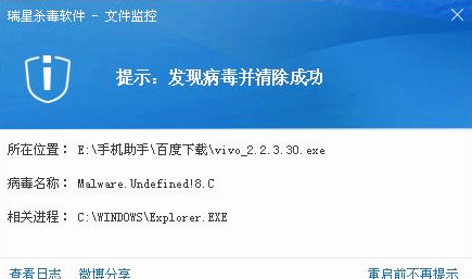 真是秒杀哦!我头天下载ViVo手机助手软件包时还没有事,第二天只把存放软件的文件夹打开,还没有安装,ViVo手机助手软件包就被V17杀掉了。其实我安装的V17的设置是发现病毒时“询问我”,是“手动处理”,而不是“自动处理”,怎么设置没有效呢?:kaka2: