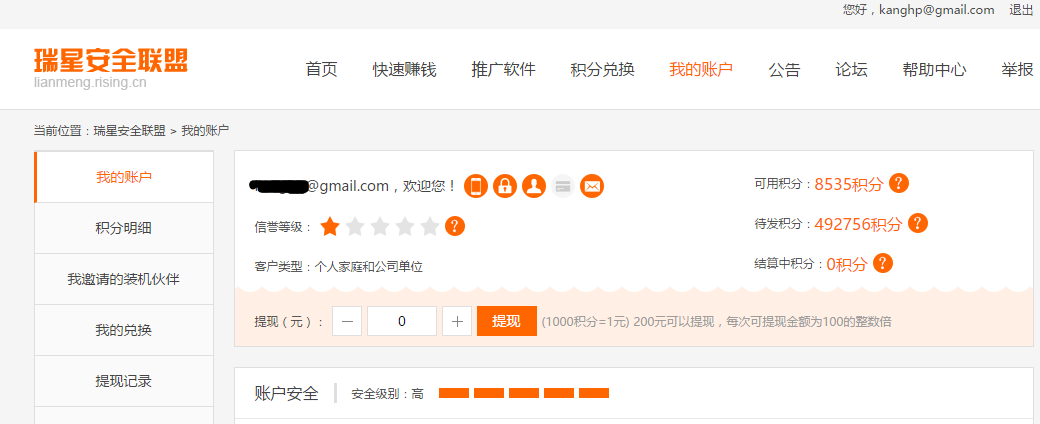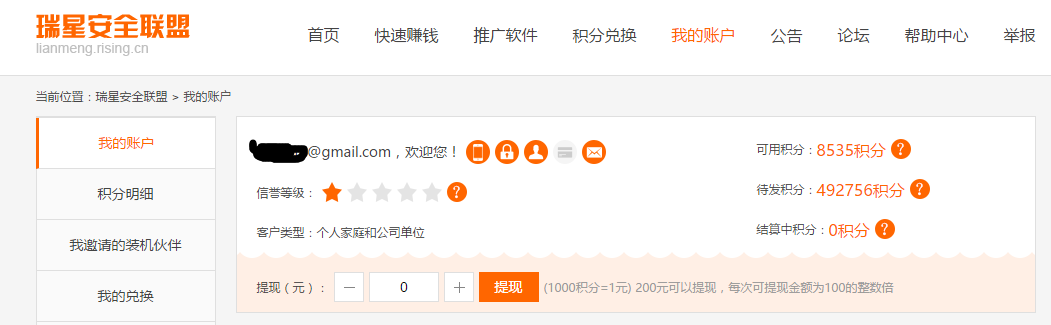 瑞星联盟软件,6月份双倍积分啦,装一台就是3000积分,等于3元,另外还有导航网址每日0.14,小伙伴们,快来挣积分挣钱吧。推广不到一个月,我已经赚了50万积分啦!