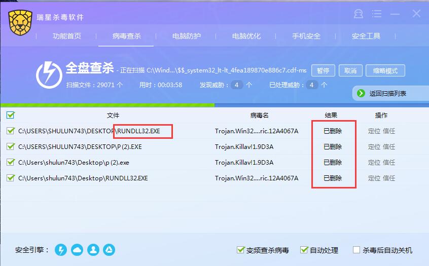 发现只要有 病毒进程 就无法 处理成功 ,虽然 主程序 中提示 删除了 ,但是 桌面上 还是存在 病毒文件