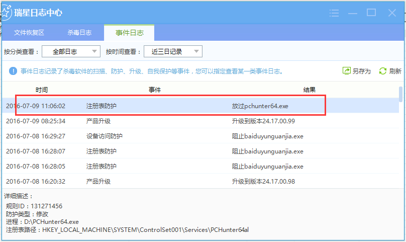 而瑞星没有发现后续的拦截修改和删除的动作拦截提示!!!