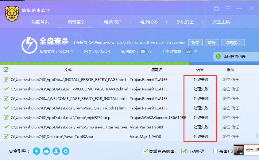 2、有处理失败的样本,win7-32下瑞星总是处理失败