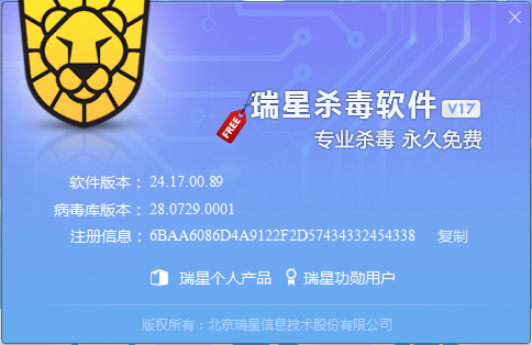 如图“RSMain.png”,初次安装瑞星杀毒软件V17,可以看到上次更新时间:2016-07-29 10:01,也就是说刚刚更新的。