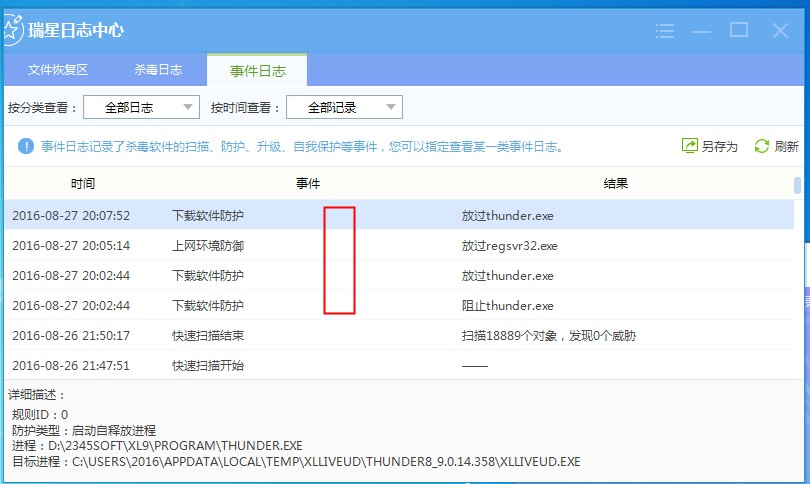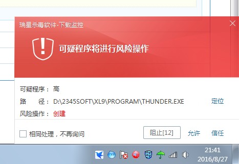 安装迅雷最新版本时,瑞星弹出一个红色的对话框。(由于当时没有截图,所以没有办法提供)