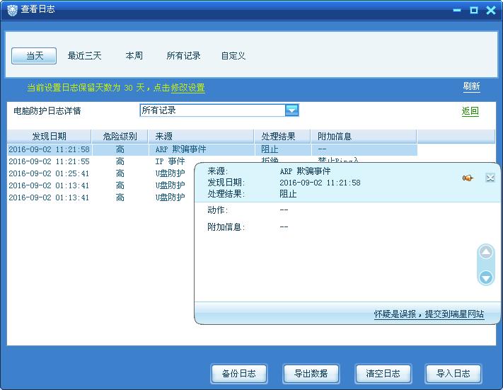 2、右键点击屏幕右下托盘中的小伞——查看日志,看arp欺骗事件的日志里,有写冒充的IP和MAC吗?