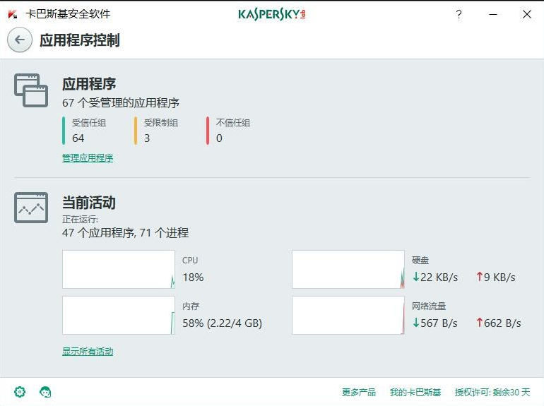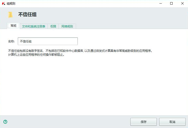 卡巴 将对 程序的 控制分成了三个组 , 信任 、不信任和 限制组!!!