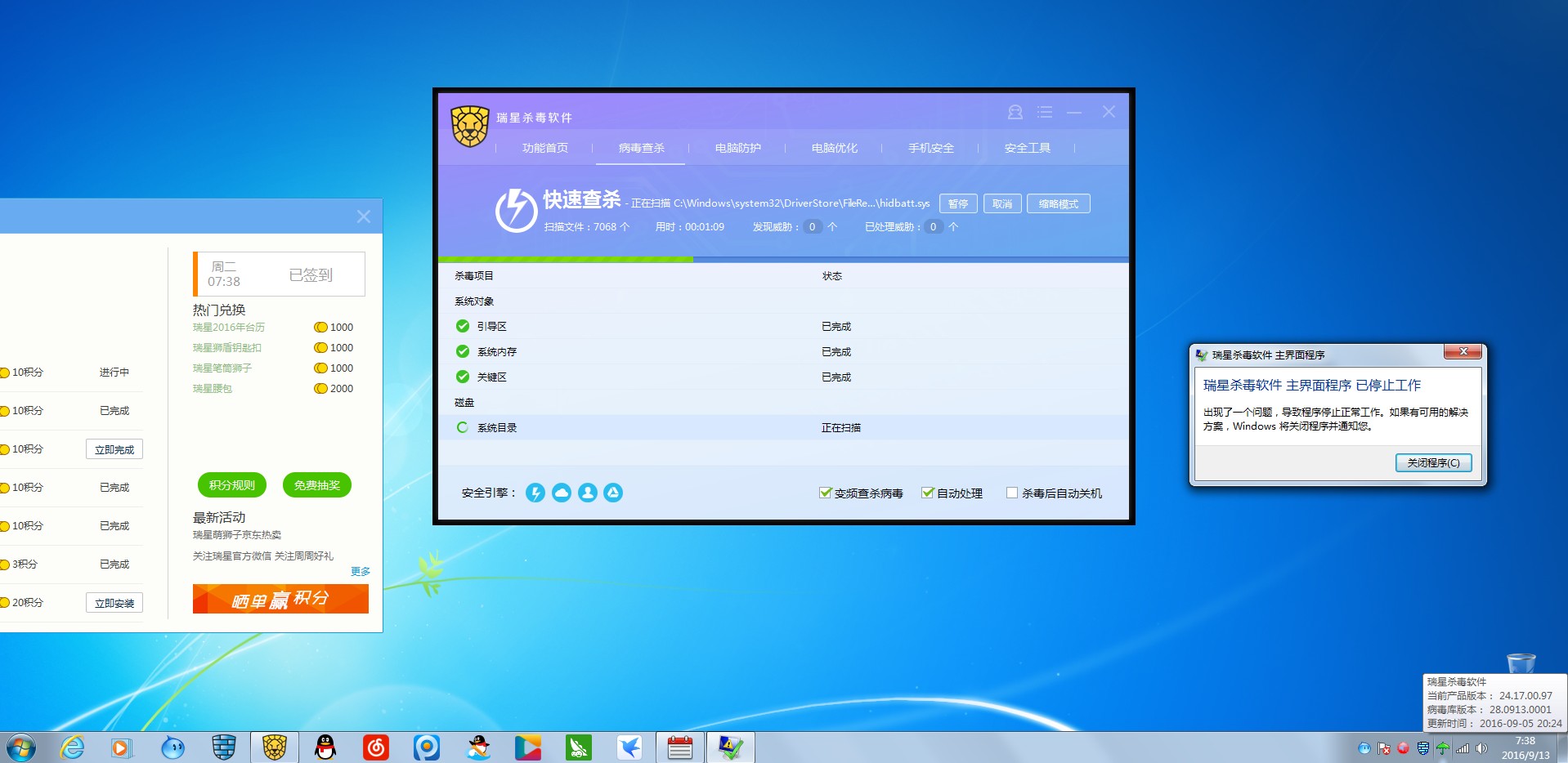 请查看瑞星安装目录下是否有rsmain.exe的dmp的文件,如果有,请压缩跟帖发来。