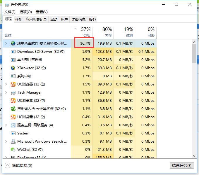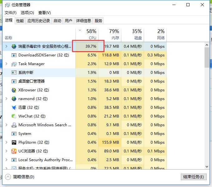 1、关闭 瑞星所有防御,发现还是 占用很高!!!