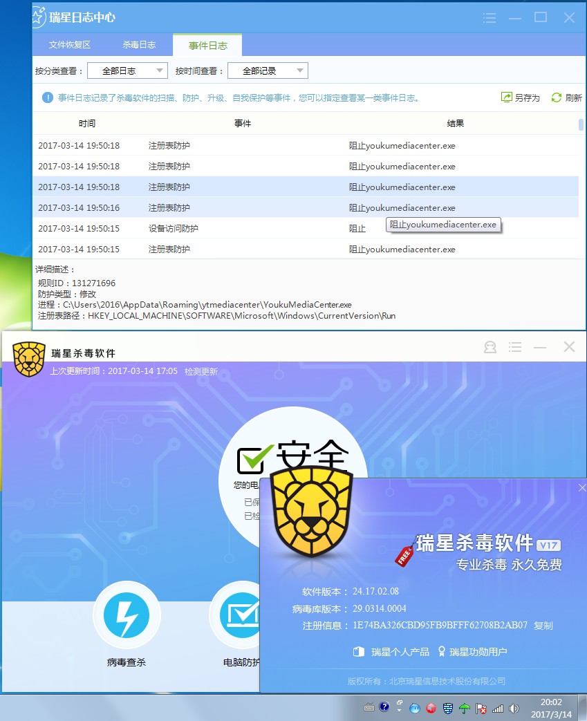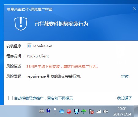 安装完最新版优酷软件后,出现疑似误报的现象。(如图所示)