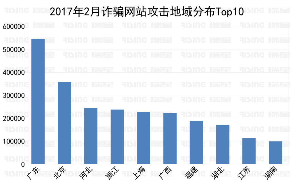 据瑞星“云安全”系统显示,2017年2月共拦截诈骗网站攻击319万余次,攻击机器总量30万台,平均每台机器被攻击10.7次。广东省受到诈骗网站攻击54万次,位列第一位,其次是北京市受到诈骗网站攻击36万次,第三名是河北省受到诈骗网站攻击24万次。