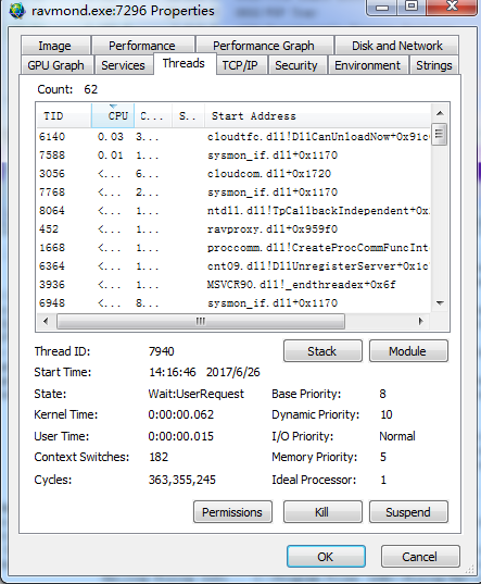 注意,如果您提取出来的dmp文件是0kb的,就不用上传了。请procexp里双击ravmond进程,会打开这样一个窗口,选择Threads页,按CPU占用从高到低排序,截个图发上来: