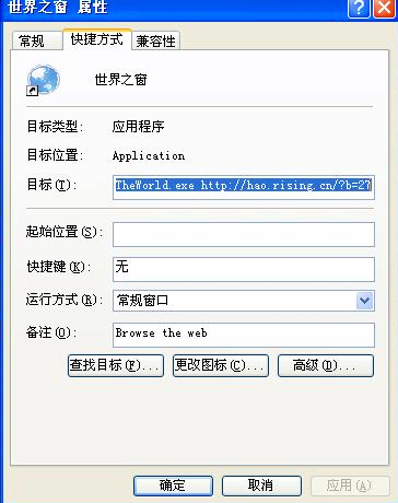 2、右键点击世界之窗的图标,选属性,清理下命令行参数,如图: