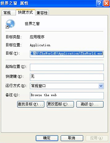 目标后面 "C:\Program Files (x86)\Internet Explorer\iexplore.exe",您那看到的应该是世界之窗的路径加引号,如果这后面还有字符,请删除。