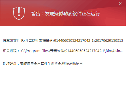 在执行备份动作之前,进程Aisino.Framework.Startup.exe是存在的,一执行备份动作该进程就被杀死,并报疑似勒索病毒的报错信息