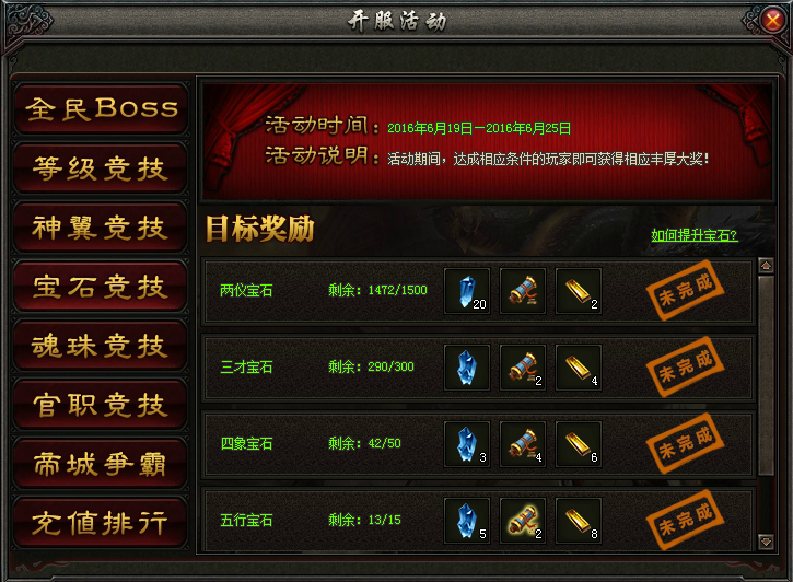 活动内容:开服活动期间,人物宝石升级指定等级,即可领取对应等级的奖励