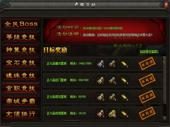 活动内容:开服活动期间,人物官升级指定等级,即可领取对应等级的奖励