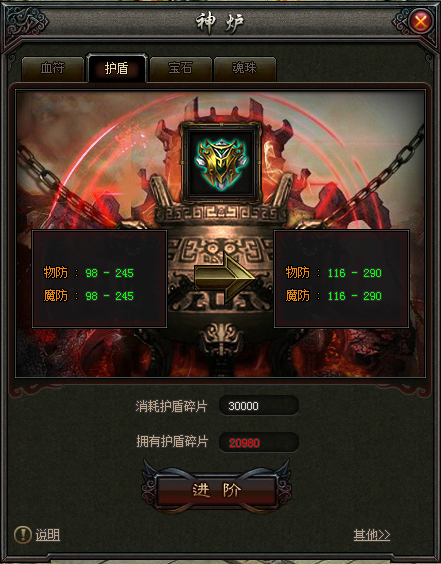 神炉可以炼化碎片,提升玩家血符、护盾、宝石、魂珠等级。
