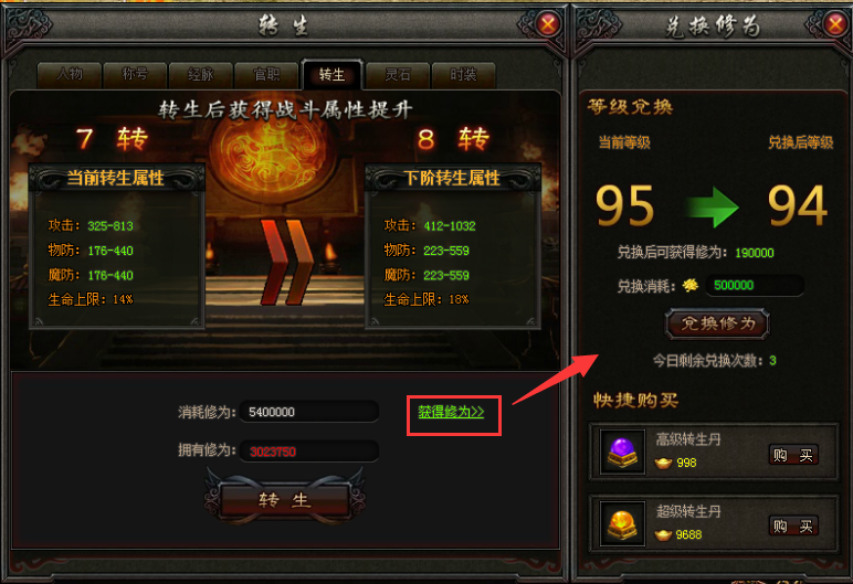转生需要消耗修为,修为可以通过等级兑换、高级转生丹、超级转生丹获得