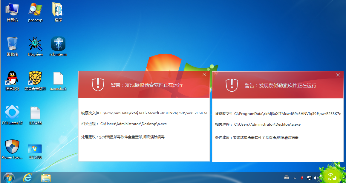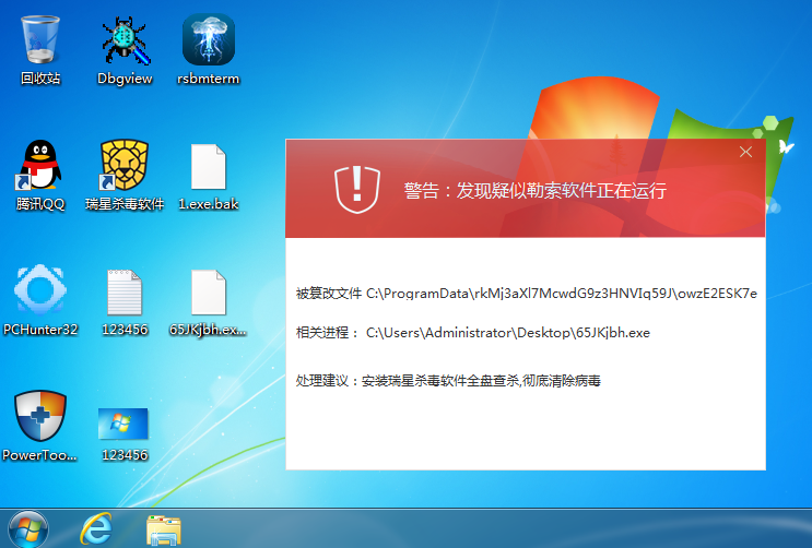 1、 瑞星之剑报警了 ,并且 将 病毒 文件,添加了 备份的 后缀 名